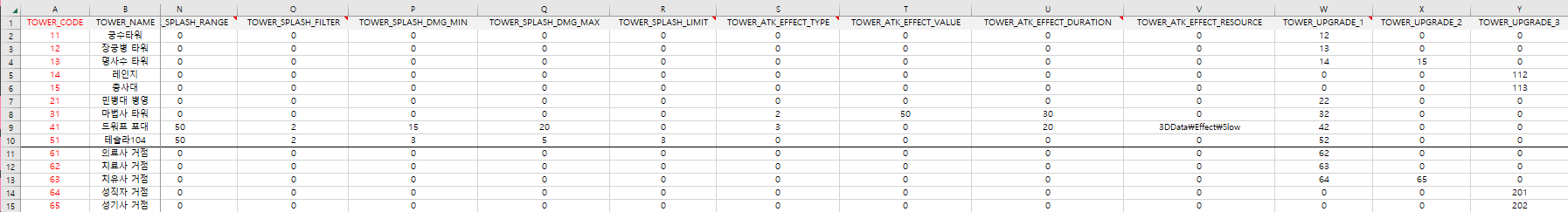 TOWER_CODE,TOWER_NAME,TOWER_TYPE,TOWER_LEVEL,TOWER_GOLD,TOWER_RESELL,TOWER_ATK_TYPE,TOWER_ATK_DMG_MIN,TOWER_ATK_DMG_MAX,TOWER_ATK_SPEED,TOWER_ATK_RANGE,TOWER_ATK_TARGET,TOWER_SPLASH_TYPE,TOWER_SPLASH_RANGE,TOWER_SPLASH_FILTER,TOWER_SPLASH_DMG_MIN,TOWER_SPLASH_DMG_MAX,TOWER_SPLASH_LIMIT,TOWER_ATK_EFFECT_TYPE,TOWER_ATK_EFFECT_VALUE,TOWER_ATK_EFFECT_DURATION,TOWER_ATK_EFFECT_RESOURCE,TOWER_UPGRADE_1,TOWER_UPGRADE_2,TOWER_UPGRADE_3