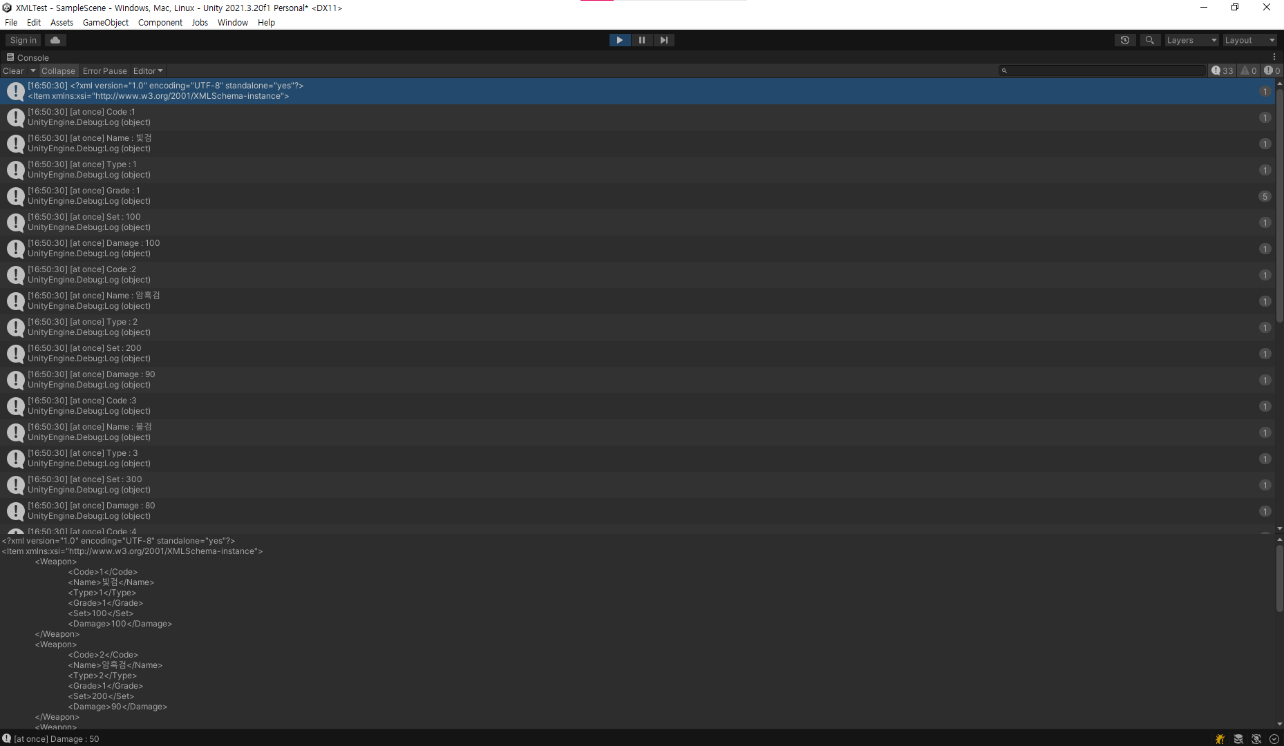 XML데이터를 Unity 스크립트를 통해서 파싱 해 보는 실습 진행.