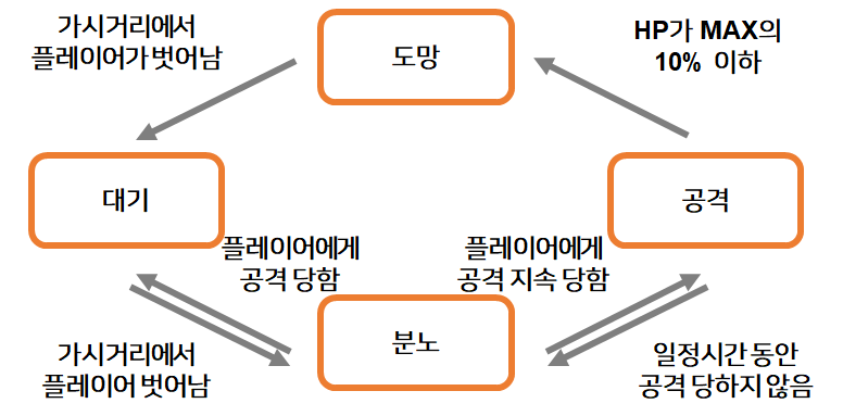 - RPG에서 몬스터가 가진 행동 패턴들은 FSM으로 구현되는 경우가 많다.