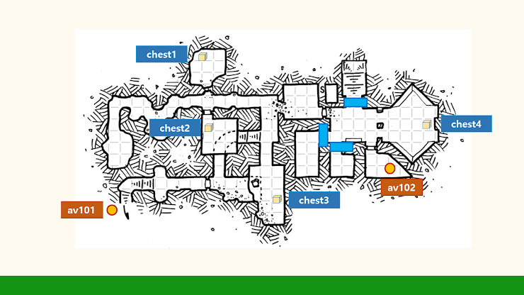 다음 상자들에 해당하는 데이터를 입력하라 chest1 : 열쇠로 열 수 있고, 열면 '투명한 구슬' 아이템을 얻을 수 있다. chest2: 열쇠로 열면 전송함정에 걸려서 던전 밖으로 나간다. chest3: 열쇠로 열면 상자가 pc를 공격한다. 열쇠는 사라진다. chest4: 화려하게 장식된 귀중품을 보관하던 상자. 열쇠로 열 수 없고, 파괴되지 않는다.