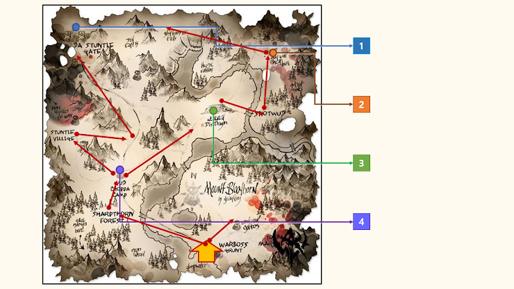 아래에서 진입해서 붉은 선을 따라 동선이 진행되는 사냥터이다.