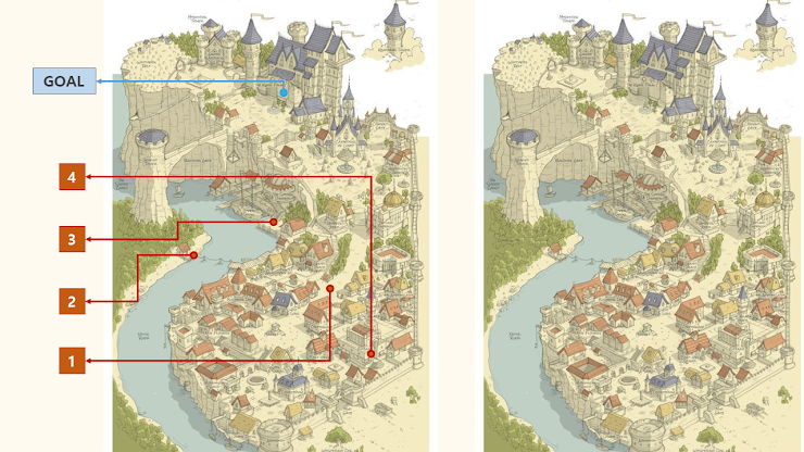 아래 위치 중 숏컷으로 가장 적당한 길은 무엇인가.