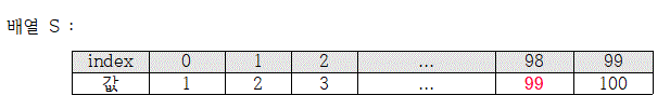 A. 1부터 100까지의 정수가 오름차순으로 저장되어 있는 배열(S)이 있을 때, 배열 S에서 정수 99를 찾고자 한다.