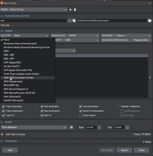 - File > Export > Audio + 파일 포맷 및 파일 이름, 저장 위치를 지정하여 결과물 내보내기