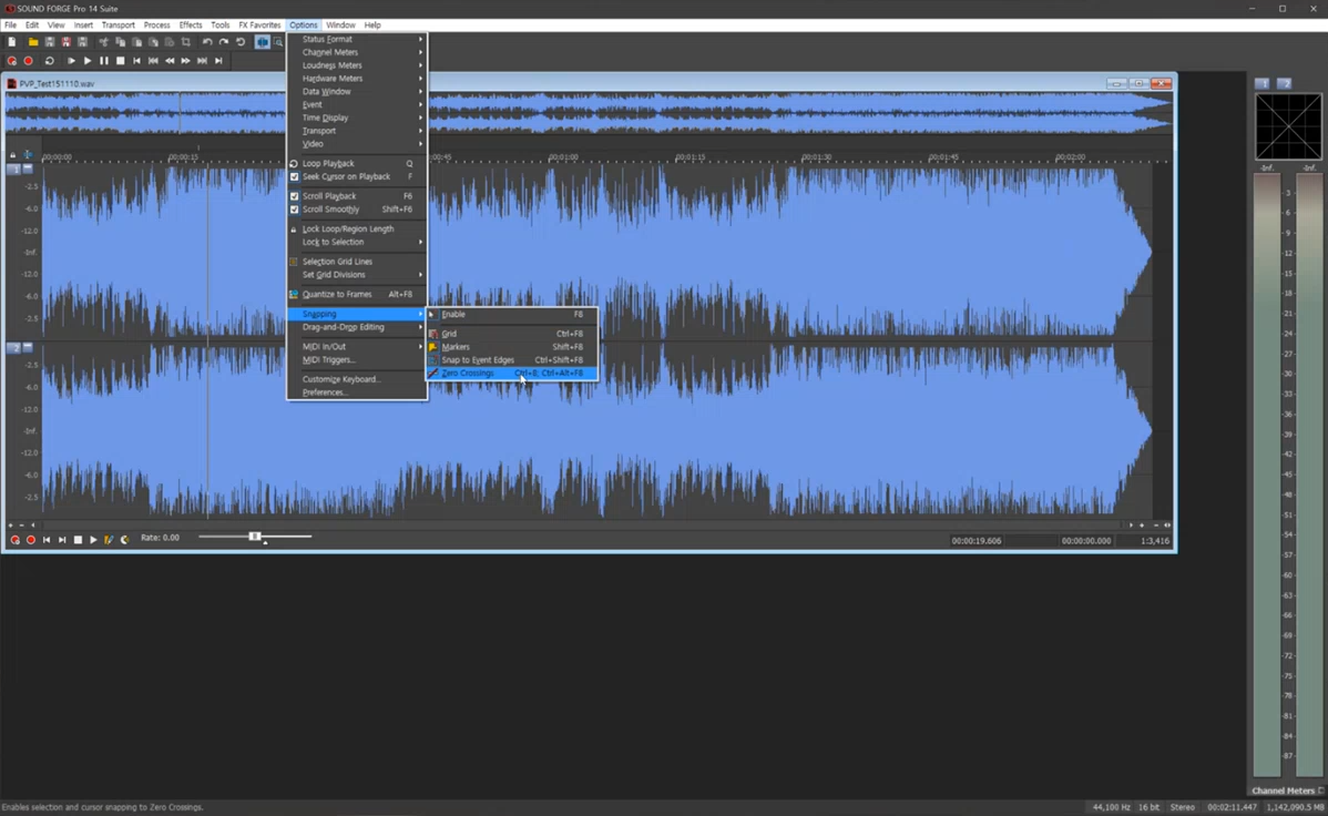 Sound Forge의 Zerocrossing 기능을 사용하면 자동 스냅과 같은 기능을 이용 할 수 있다.