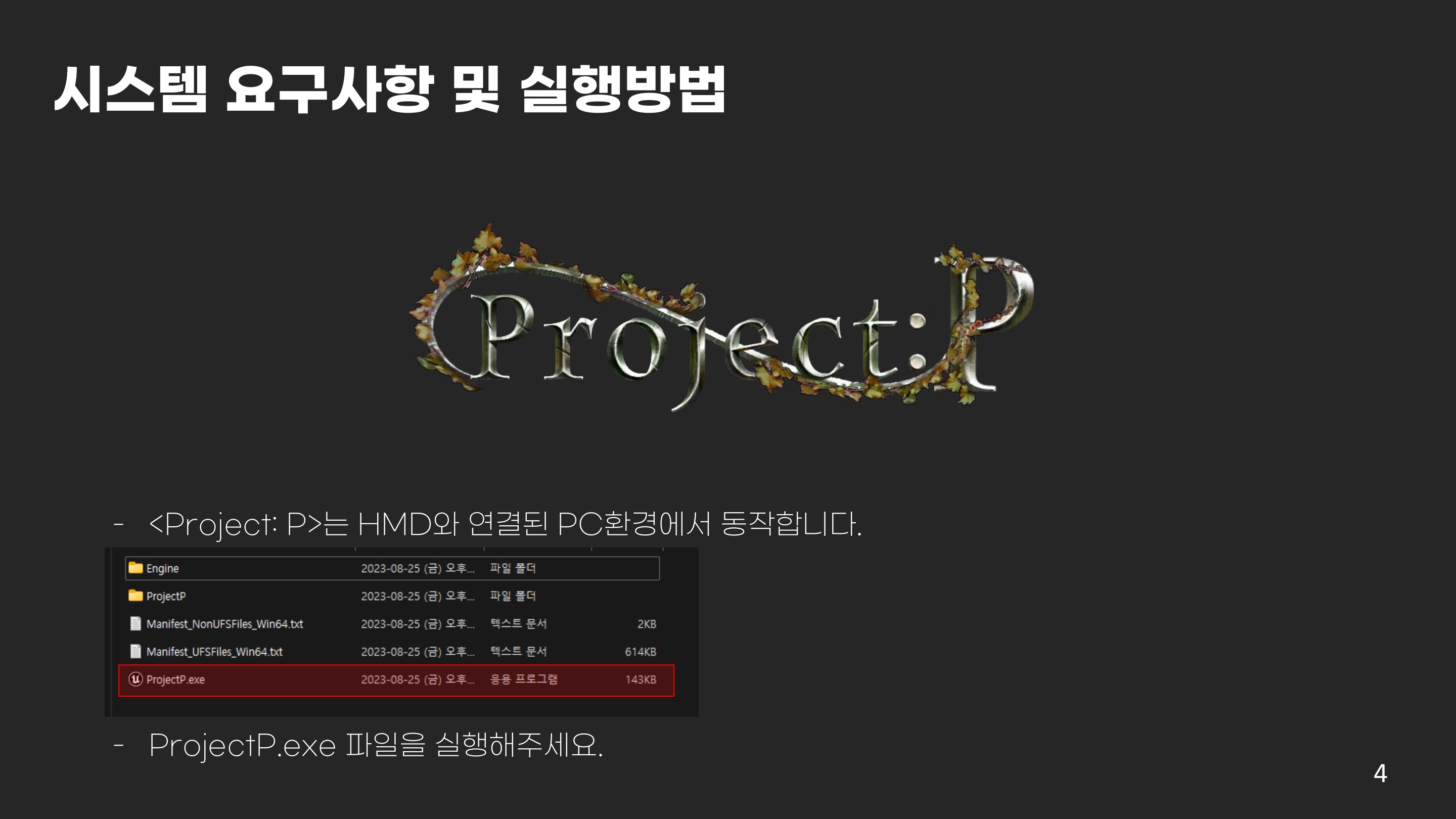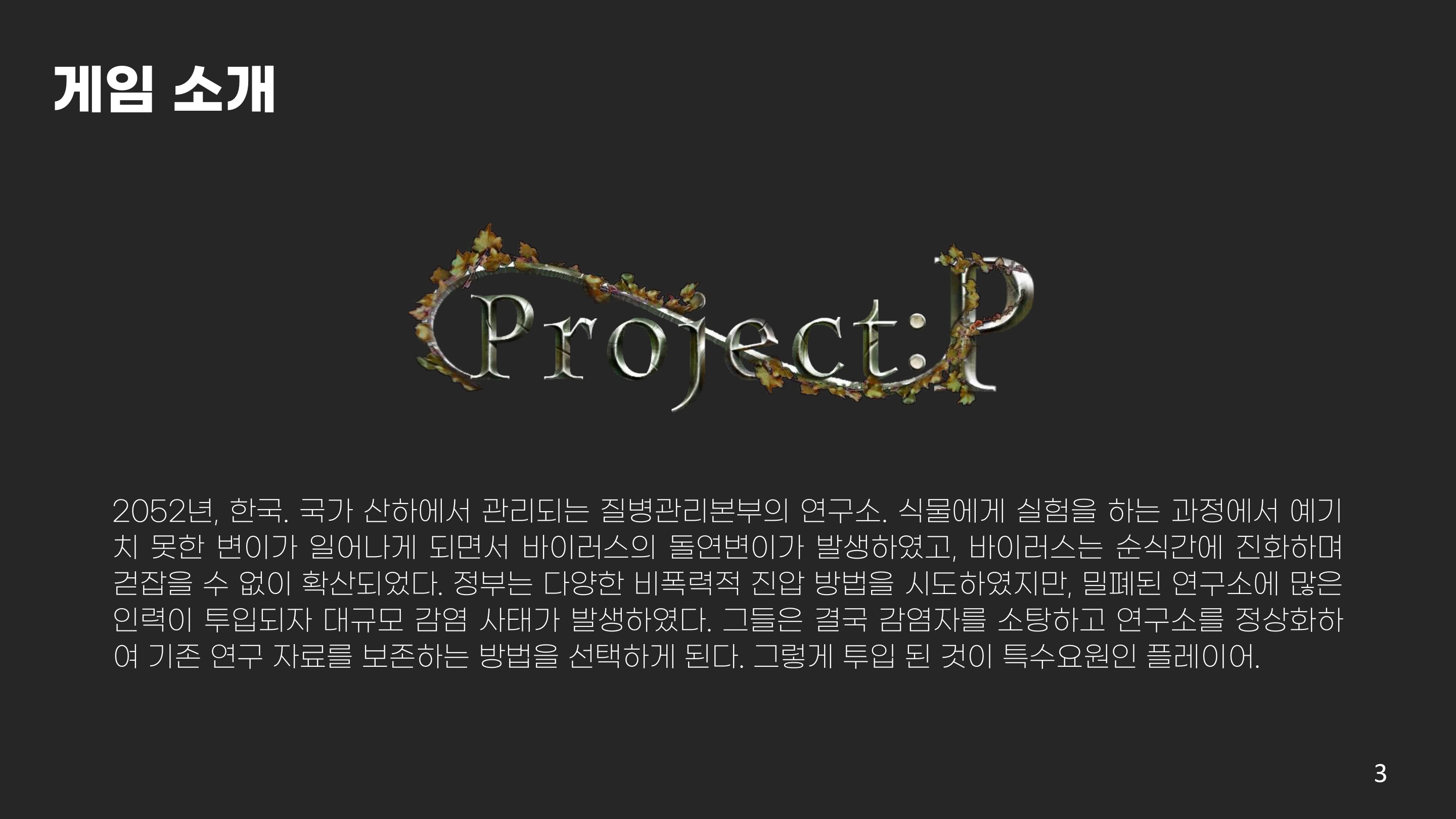 <Project: P>는 플레이어가 특수요원 '신지'가 되어 바이러스가 창궐한 연구실에 잠입해 괴생명체와 전투하는 게임입니다.