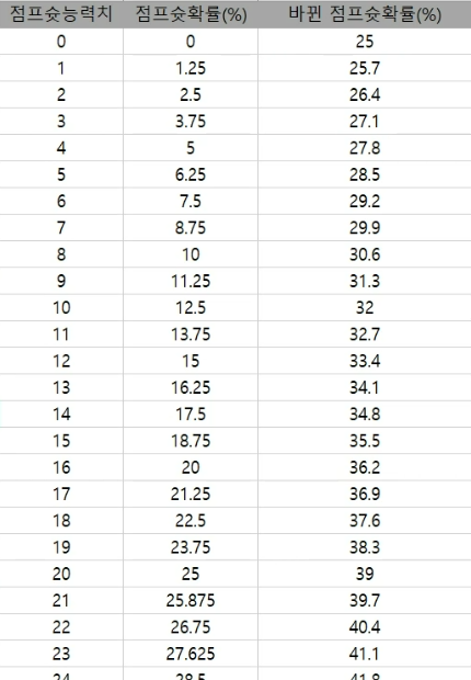 점프슛 능력치를 20개로 나눴을 때, 점프슛 능력치 1의 가치는 1.25%