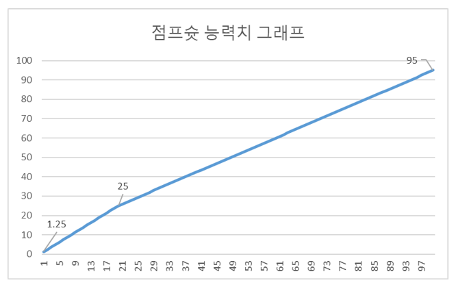 점프슛 능력치가 20일 때 25%, 100일 때 95%로 하려면 어떻게 해야 할까?
