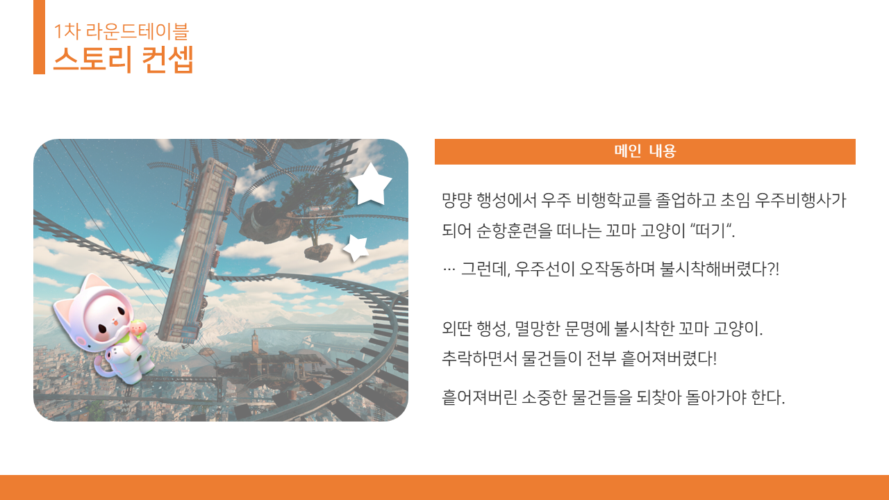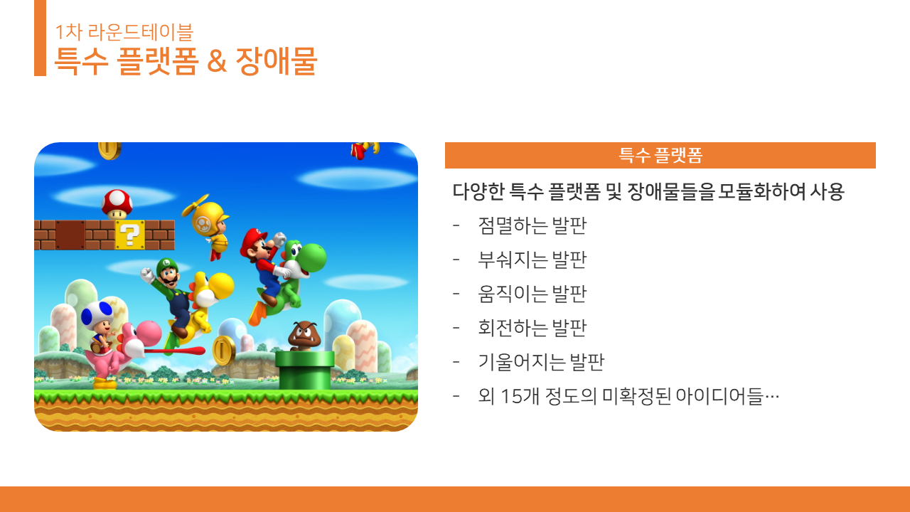 - 컨셉을 보여줄 수 있는 맵 디자인과 전용 플랫폼 사용하면서 층의 느낌만 보여줌. 부숴지는 발판과 점프대, 바람 등…