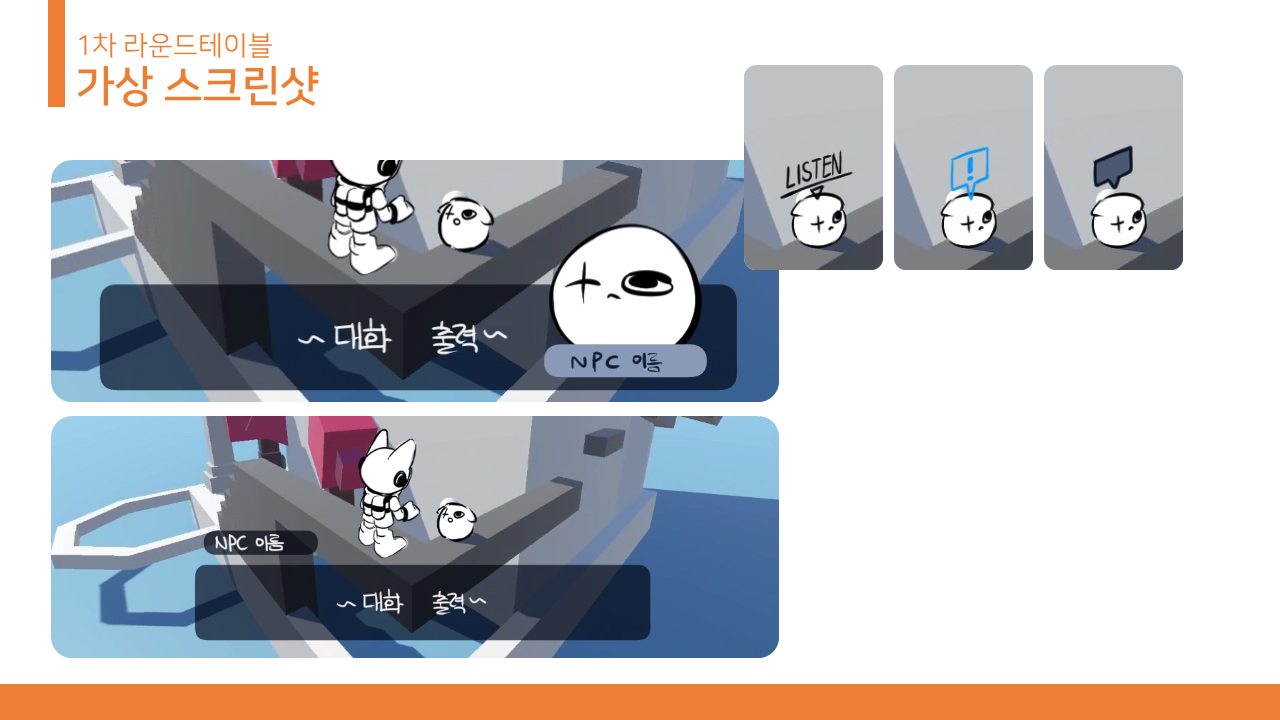 - ex : (1층 1면에서 봤던 NPC가 따라오고 있던 설정)(이에 따라 2면 3층의 NPC가 추가로 합류하게 되어도 좋을 것 같다. 별도의 시나리오 논의 필요) 바닥에 떨어져있던 소울 스톤을 획득하자, (NPC 이름)이 다가왔다. 세계에 대한 설명.