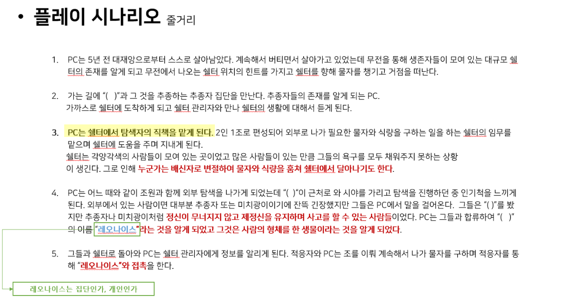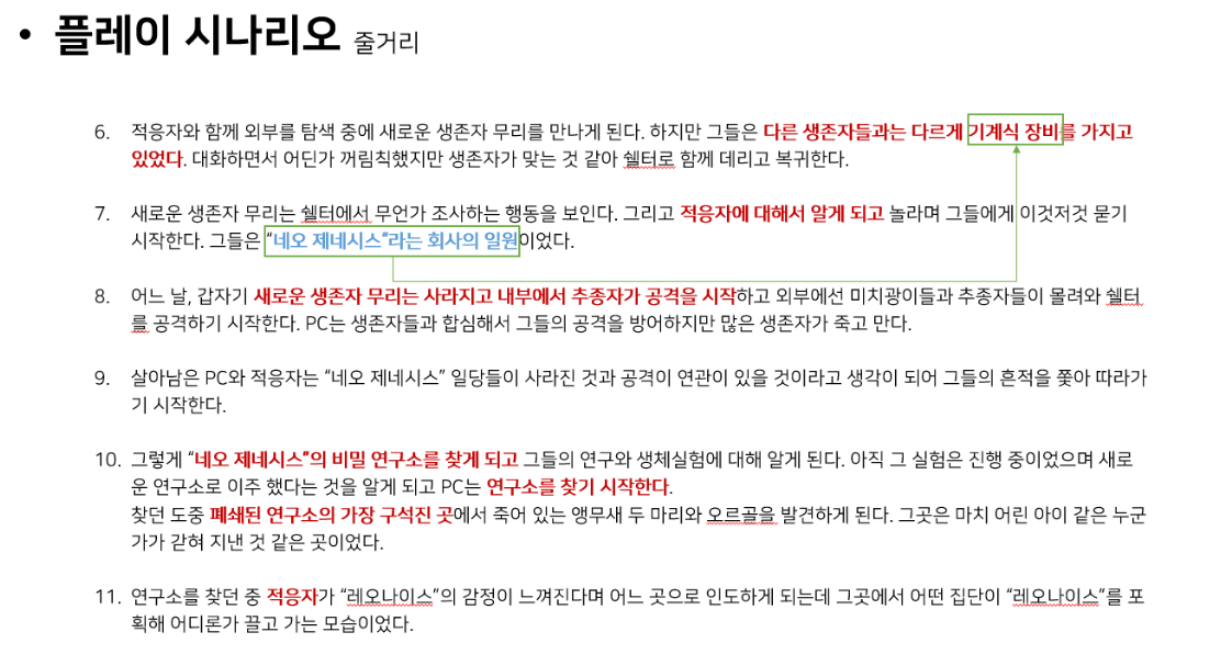 세부적인 플레이 시나리오와 같은 경우에는 쉘터 습격을 하거나, 비밀 연구소 진입을 풀어나갈 수 있을 것.
