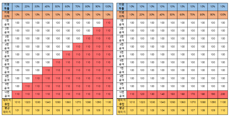 공격력이 50이고 치명타 피해가 2배라면 10번 때렸음에도 11번 때린 효과