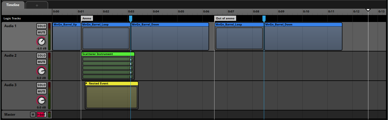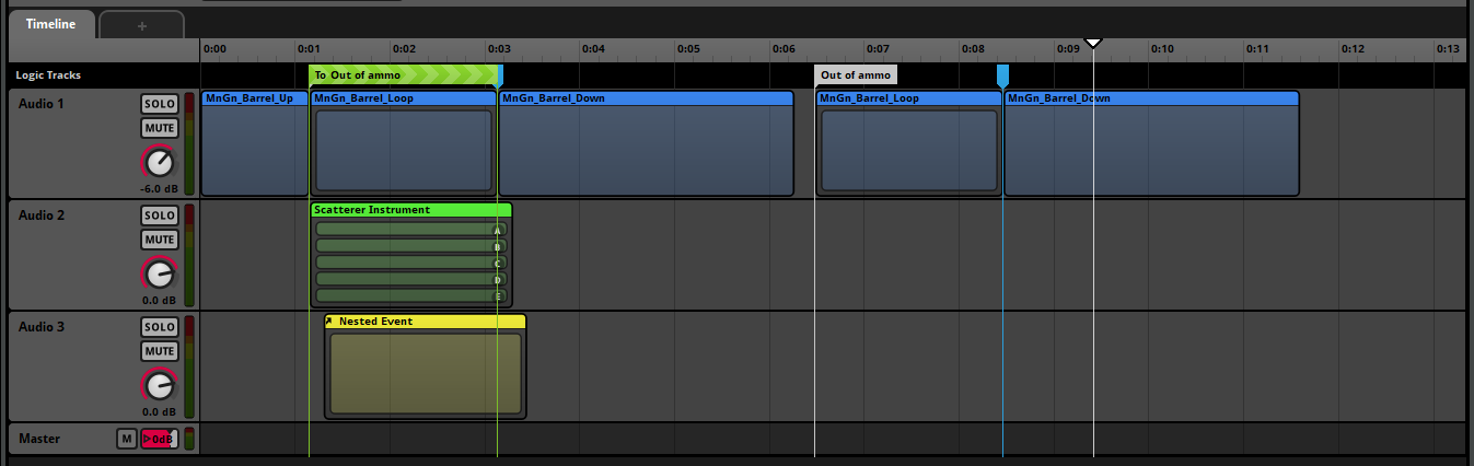 탄피를 타임라인에 배치하면 하나의 재질만 표현이 가능하다. Nested Event 기능을 사용해서 구현 가능하다.