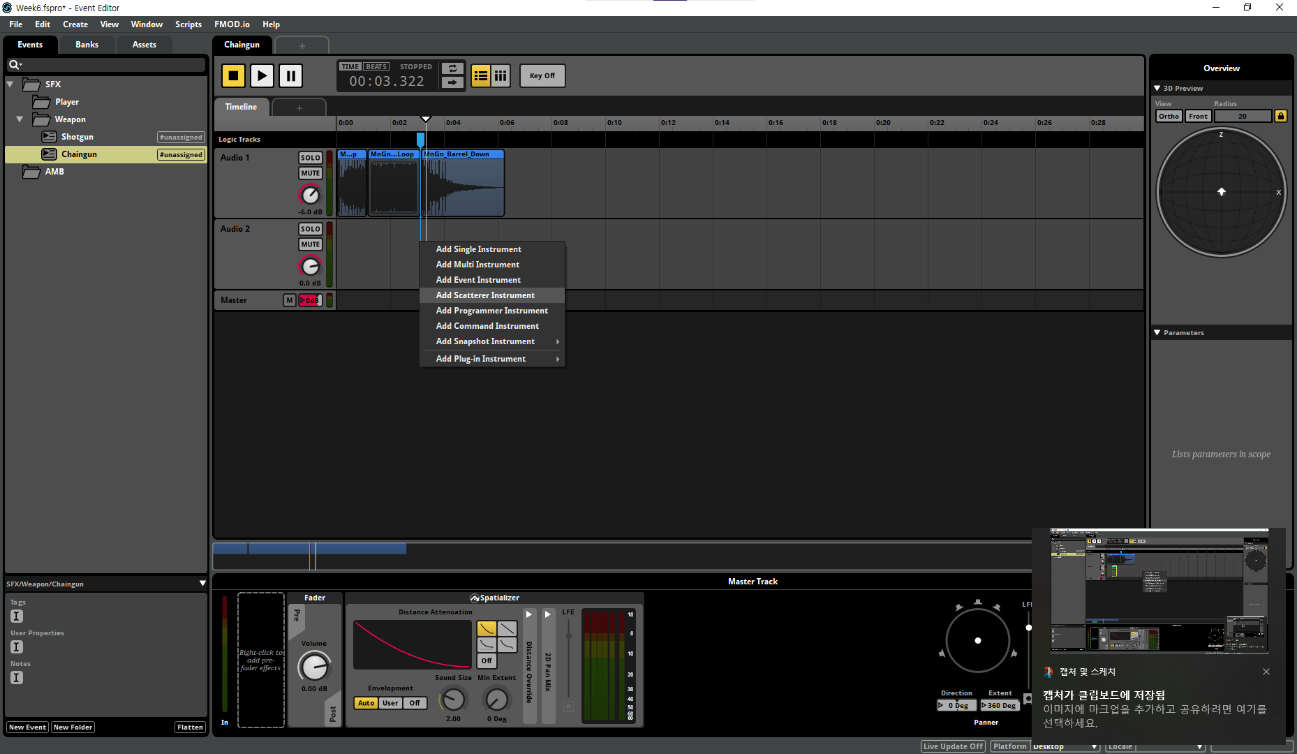 일반 사운드, 환경음 구현 기획서와 FMOD를 제출하는 것이 중간평가. 2주 후에 제출 예정.