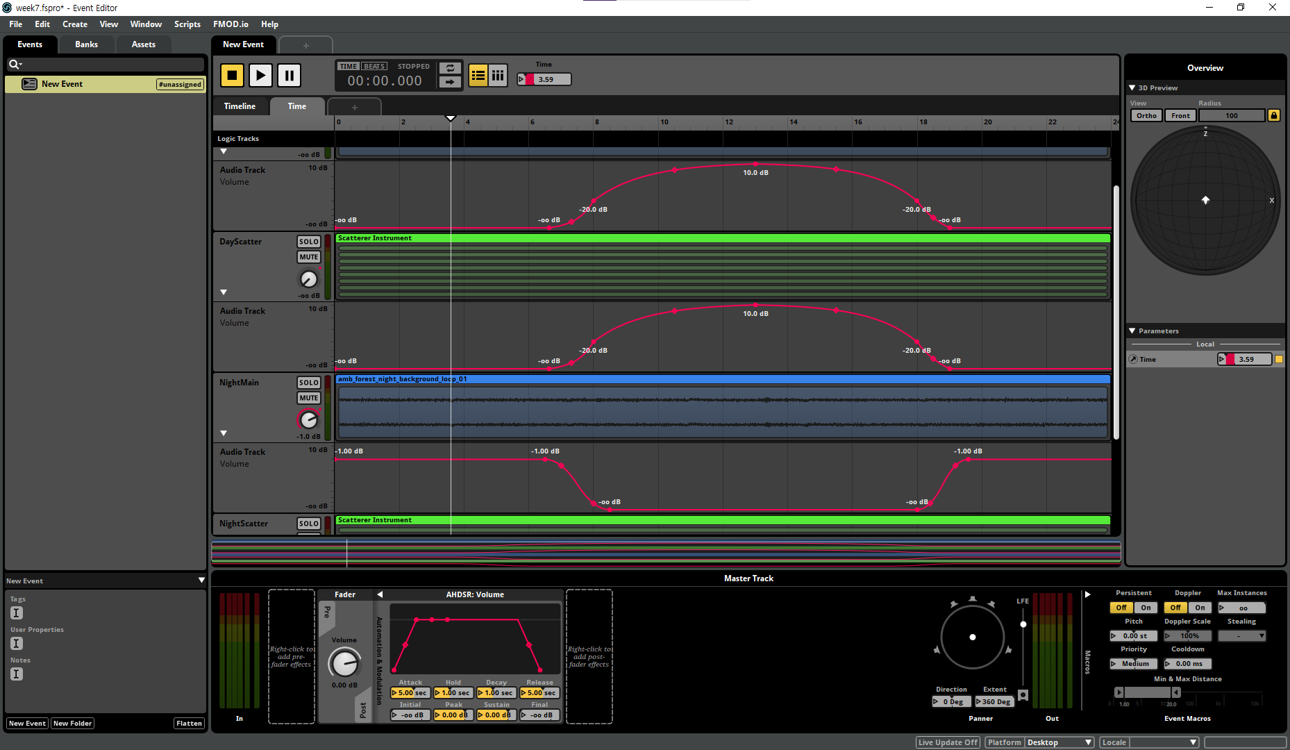 같은 공간에서 시간에 따라 유기적으로 변경되는 (오픈월드) 사운드의 실습