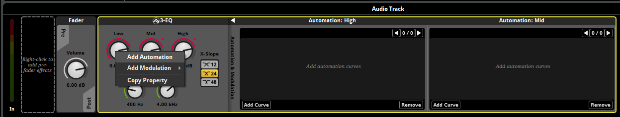 오디오 트랙에서 하단 Fader 우클릭 > Add Modulation > AHDSR 옵션 선택