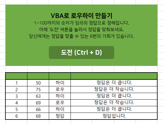 Range("B12").Offset(도전, 3).Value = "정답은 더 작습니다."