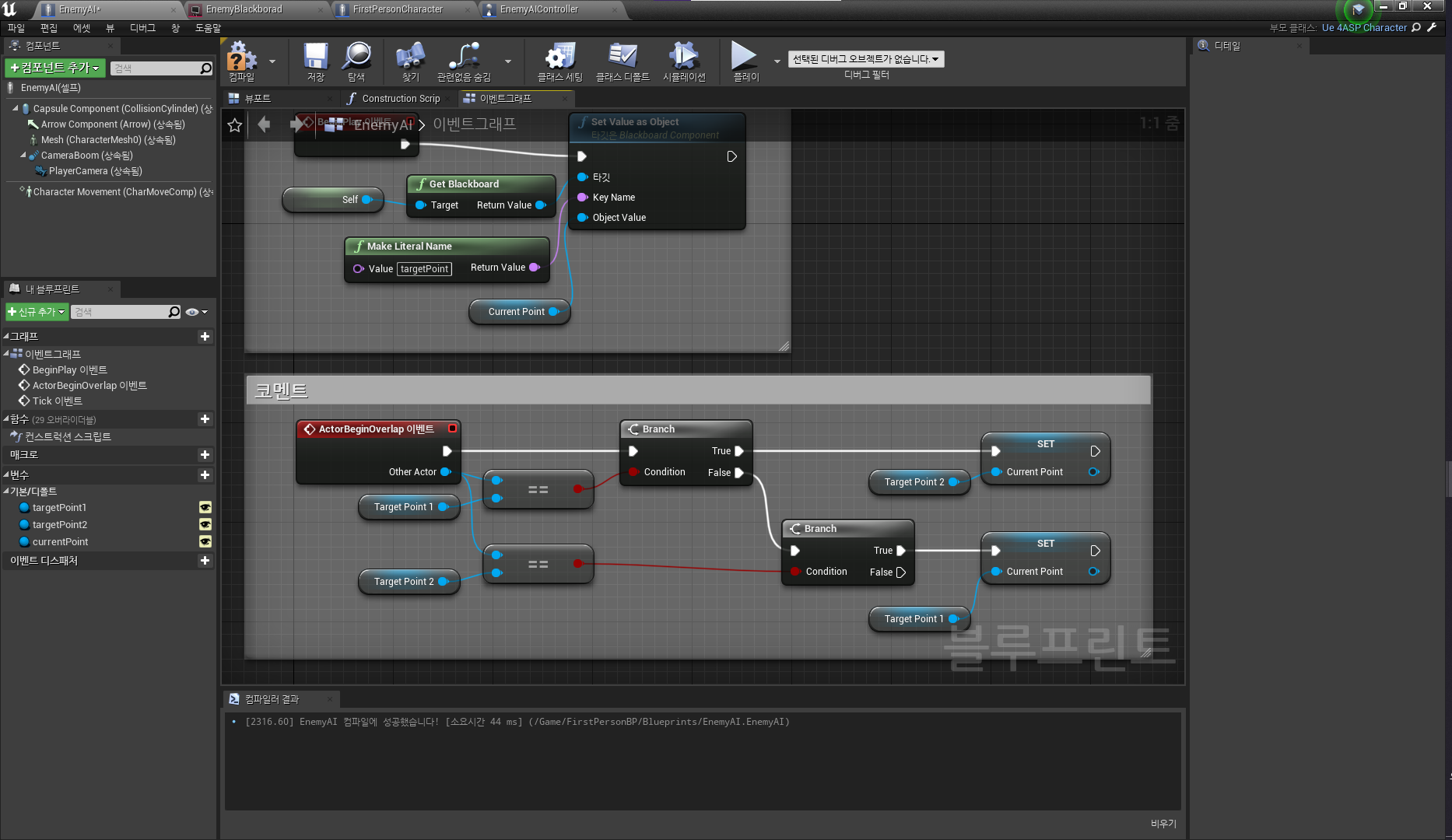 ActorBeginOverlap 이벤트에서 충돌이 일어났을 때 분기를 만들어 타겟포인트 1인지 2인지 비교하고