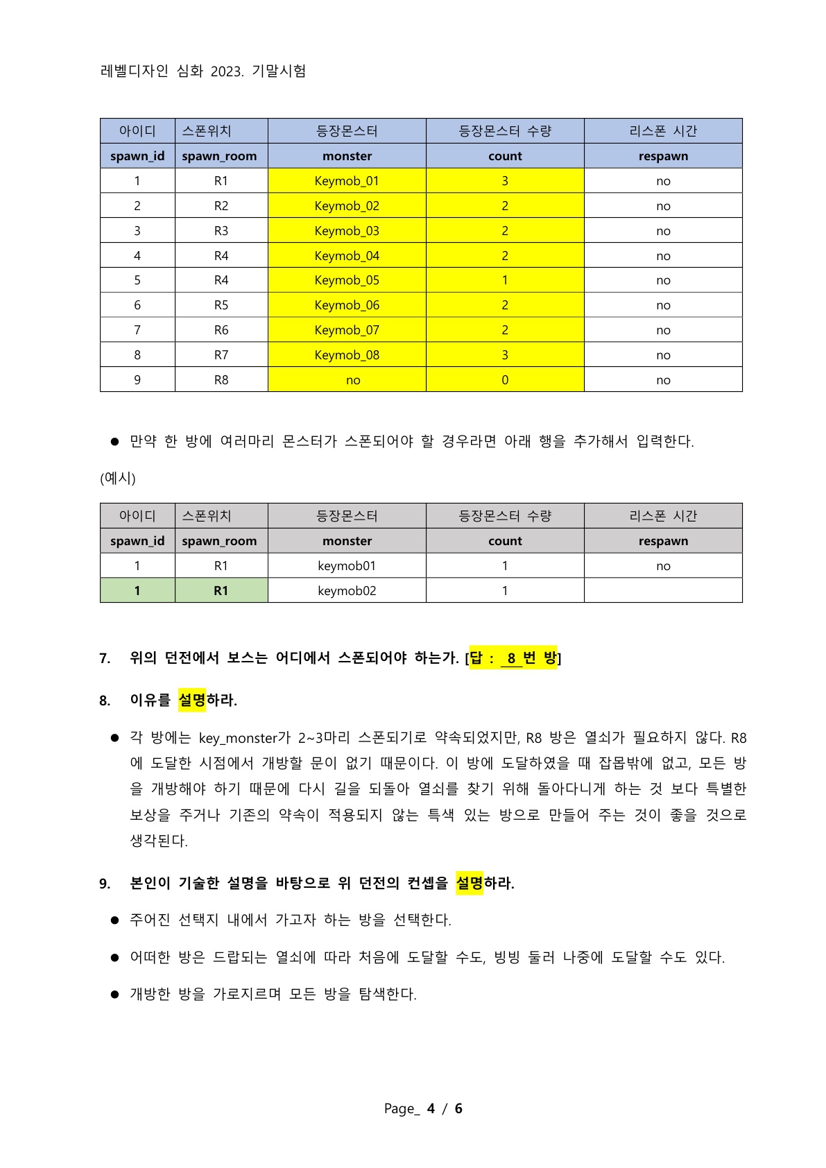 4. 위의 던전에서 열쇠를 드랍하는 몬스터는 모두 몇 마리가 필요한가. [답 : 번]