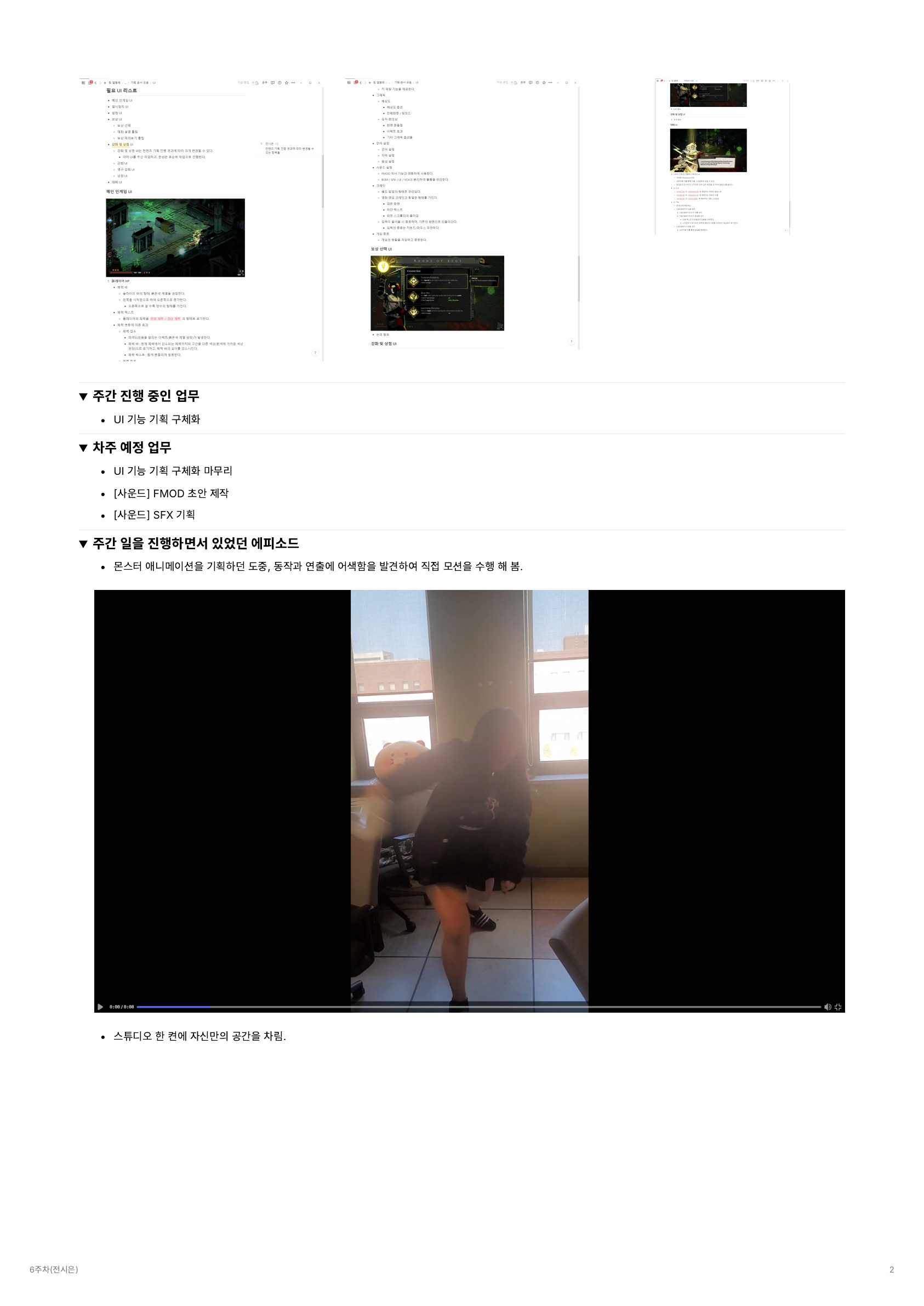 - 6주차 진행사항 : 전투 시스템/ 맵 시스템 문서 작성, 데이터 테이블 구조화 작업, 몬스터 컨셉 문서 작성, 재화 및 보상 베이스 제작, 소켓을 활용한 발소리 구현, 몬스터 탐지 디버깅 구현, 가상 스크린샷 추가, 플레이어 캐릭터 팔 UV 작업, 셰이더/ 라이팅 관련 논의, 툰 셰이더 제작 및 테스트, 몬스터 시안 제작, 포탈 모델링/ UV/ 더미 텍스쳐, 목책 모델링, 플레이어 캐릭터 리깅 및 기본 공격 4타 키 애니메이션, 와이어 공격 더미 이펙트, 히트 이펙트, 대쉬 더미 이펙트, 플레이어 공격 이펙트, 전투 시퀀스 추가