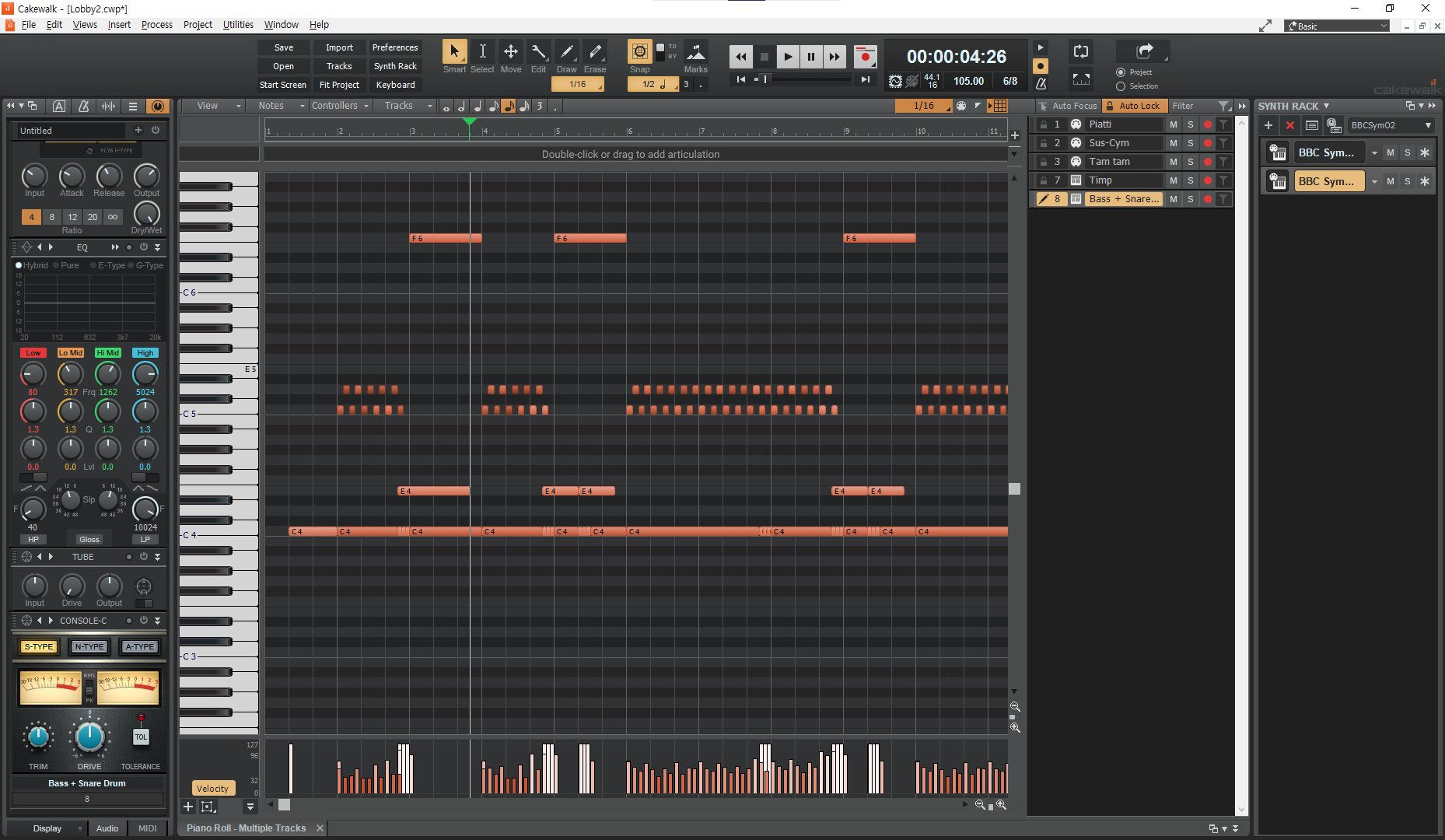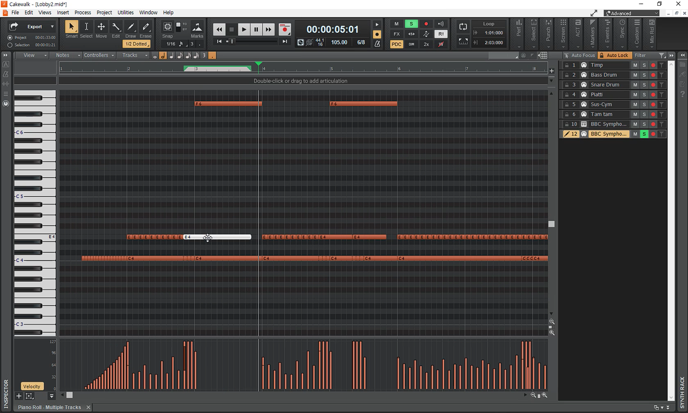 BBC 트랙을 확대하여 미디 트랙을 분리하여 사람이 연주한 것 처럼 타이밍을 조절한다.