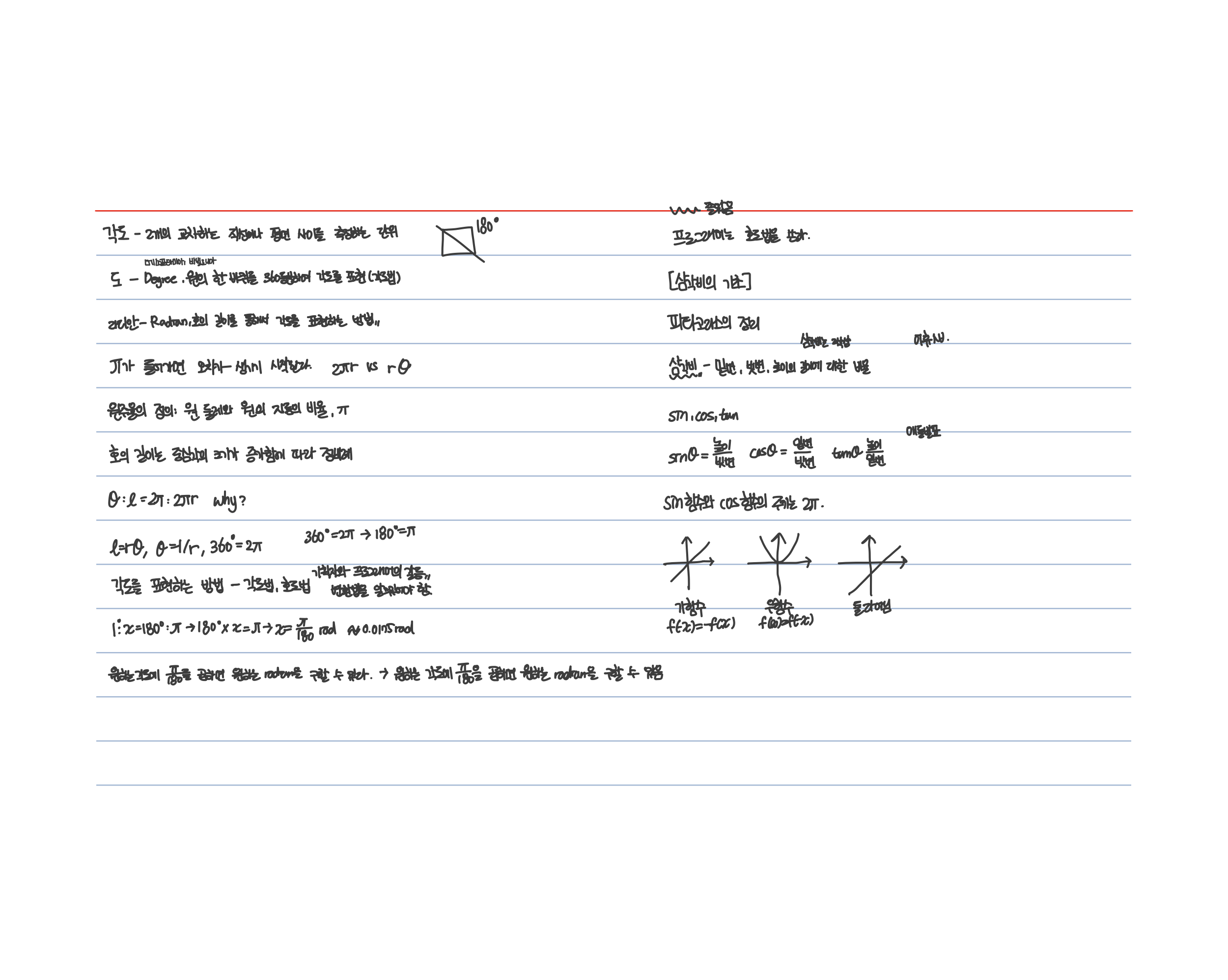 - 원하는 각도에 ㅠ/180를 곱하면 원하는 radian을 구할 수 있다.