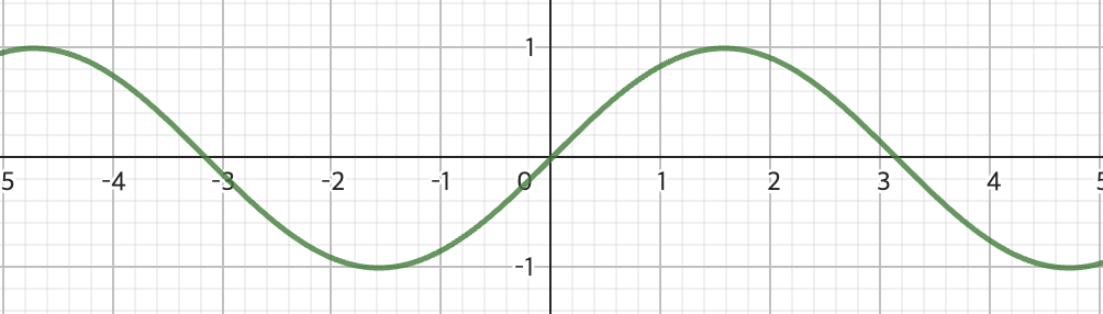 - 사인함수 : x의 범위는 모든 실수, y의 범위는 -1이상 1이하. 주기는 2ㅠ, 원점에 대칭한 형태. odd function.