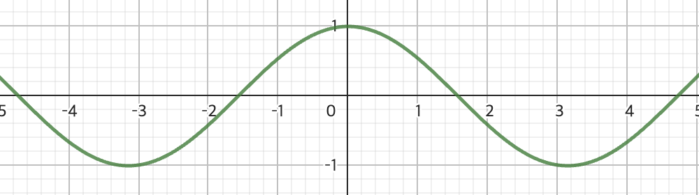 - 코사인함수 : x의 범위는 모든 실수, y의 범위는 -1이상 1이하. 주기는 2ㅠ, y축에 대칭. even function.