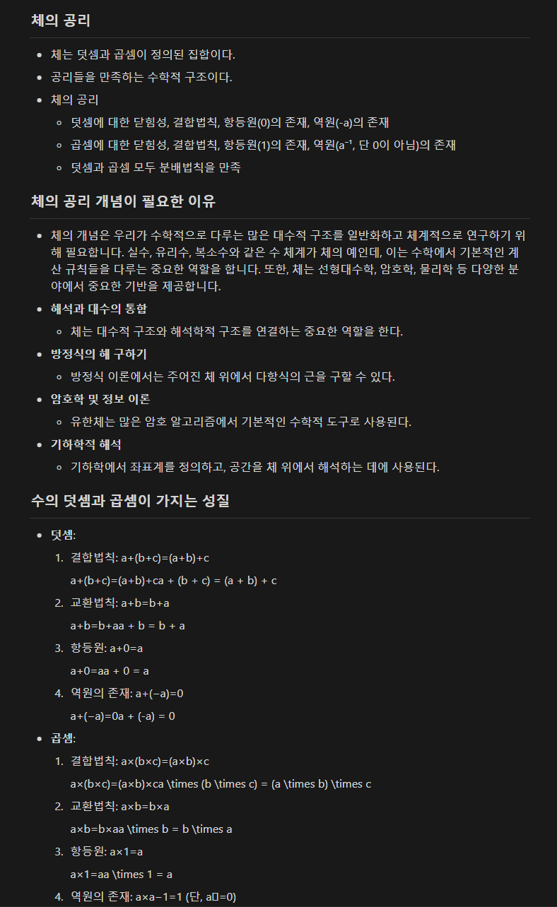 - 체(Field)의 공리를 정리하고 이 개념이 왜 필요한지 생각을 정리해보시오.
