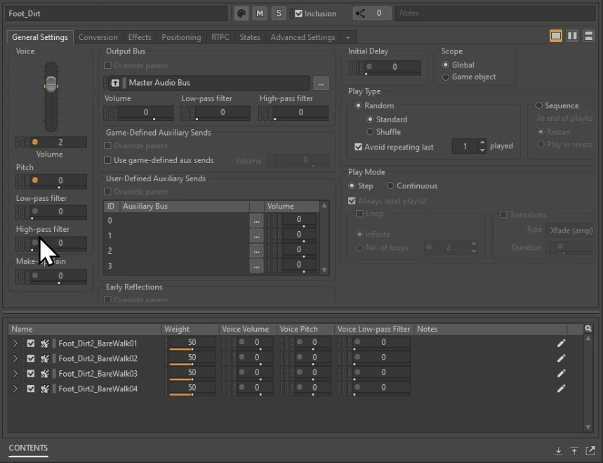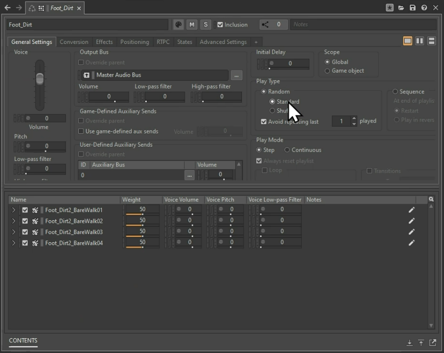 사운드가 다양한 것 처럼 느끼게 해 주기 위해 Random pitch 기능을 사용한다.