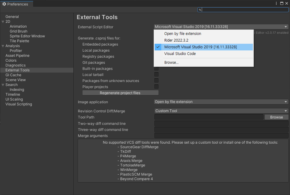 Edit > Preferences > External Tools > External Script Editor에서 Visual Studio로 설정을 해 줘도 되지 않았다.