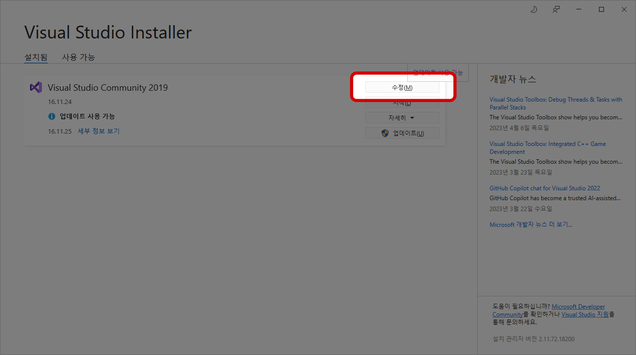Visual Studio Installer에서 설치할 때 체크박스를 실수로 풀었던 것인지... 체크 해 주지 않았던 것이다.