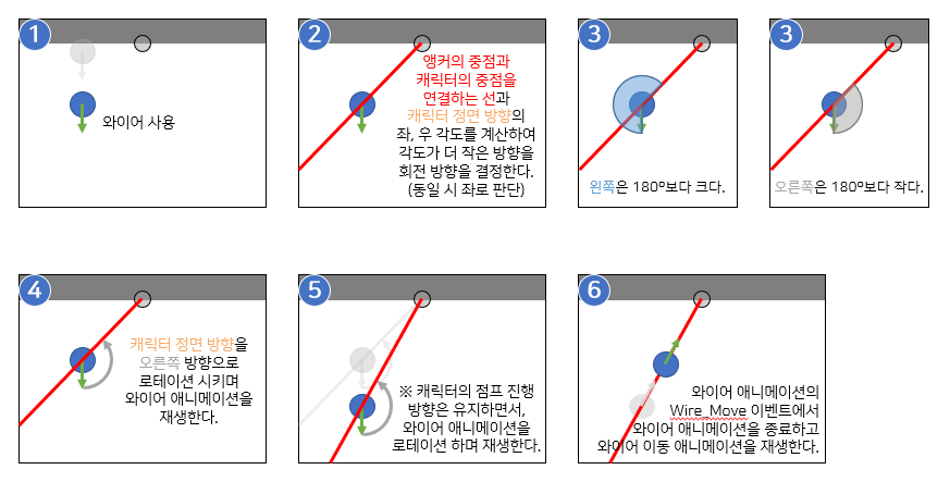 플레이어의 정면 방향이 앵커를 바라보지 않아도, 와이어 액션을 사용할 수 있다.