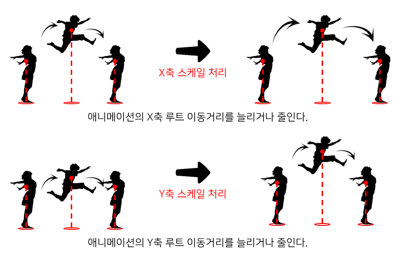 스케일 처리를 위한 애니메이션 제작 시 유의할 점 - 루트(root)가 이동해야 한다.