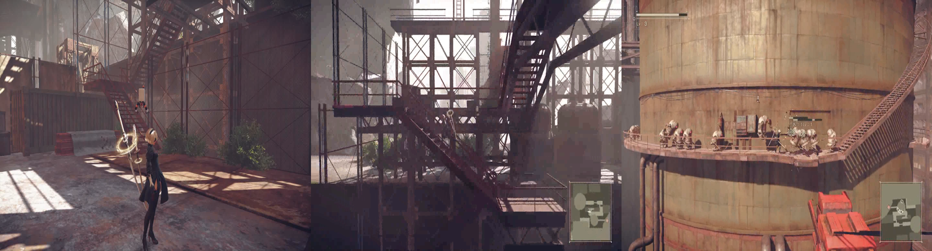니어오토마타의 벽잡기 애니메이션 구현은 애니메이션과 프로그래밍의 ‘일반적 케미’를 잘 보여주고 있다.