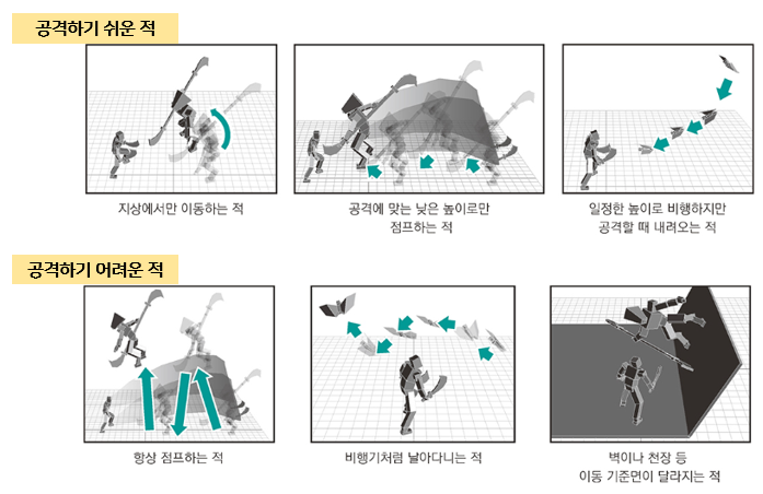 ‘적 캐릭터가 좌우도 이동'하면 플레이어의 ‘수직 베기’나 ‘찌르기‘ 계통의 공격이 잘 통하지 않게 됨