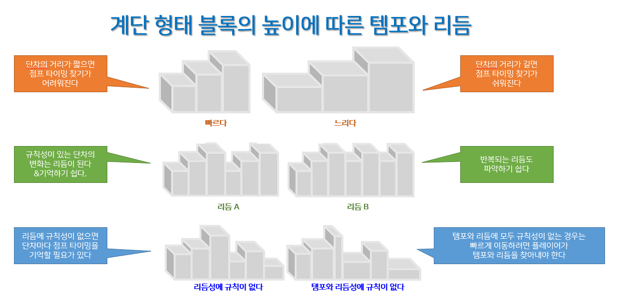 - 단차가 높아지면 도움닫기 거리에 따라 점프 높이가 달라지므로, 타이밍이 나쁘면 넘을 수 없게 된다.