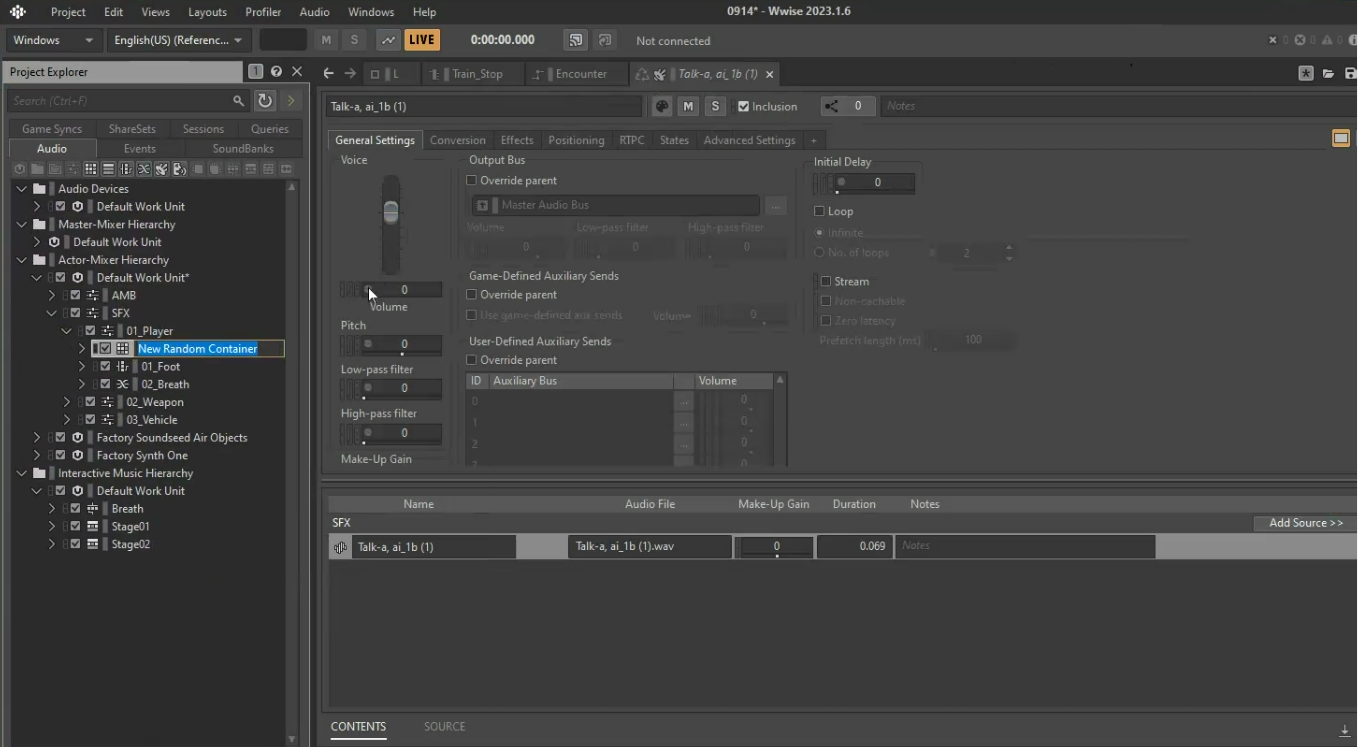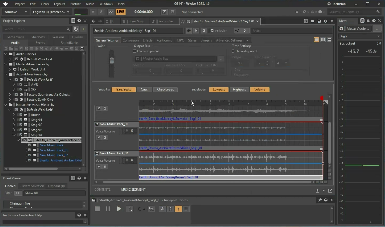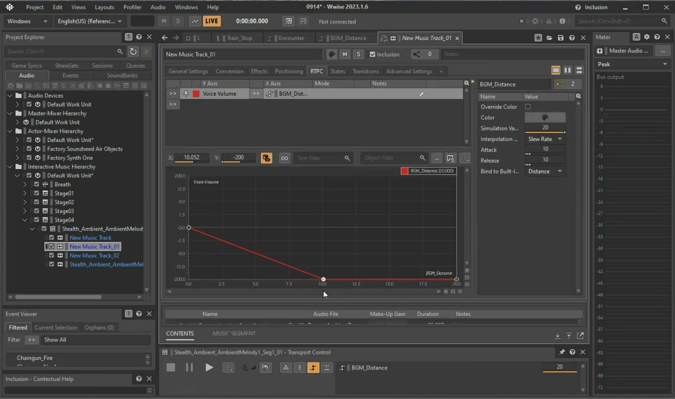 Segment로 가서 RTPC > Volume > Game Parameters로 세팅 해 준다.