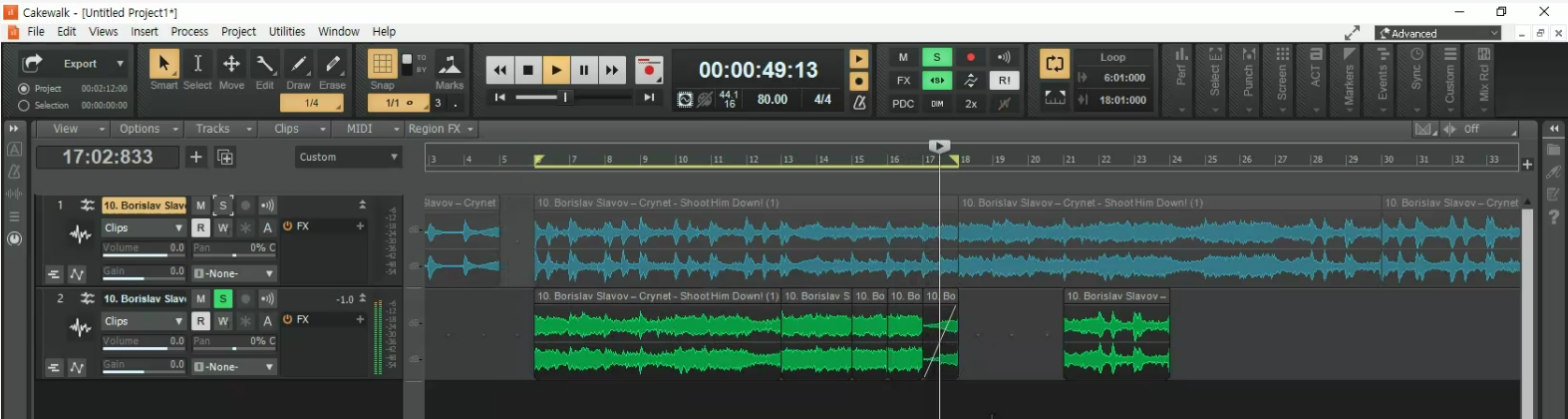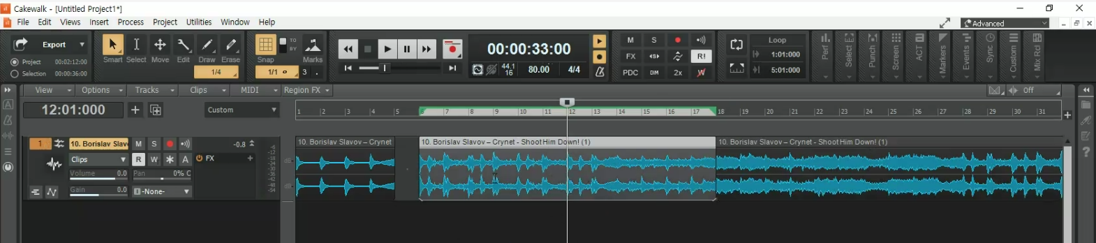 클립들을 하나로 합칠 때는 선택 > Bounce to Clip 기능을 사용 해 주면 된다.