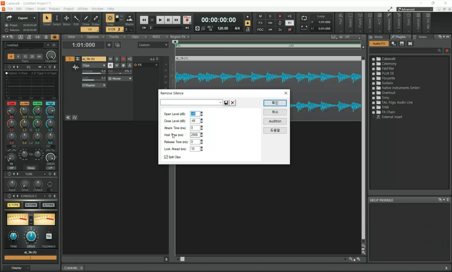 Remove Silence - Open Level과 Hold Time을 조절 해 준다.