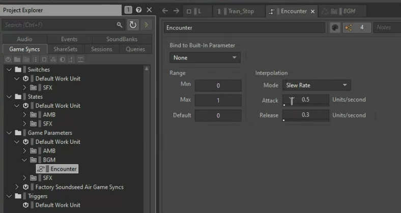 변화값을 유기적으로 넣으려면 Switches나 States가 아닌, Game Parameters를 사용해야만 한다.