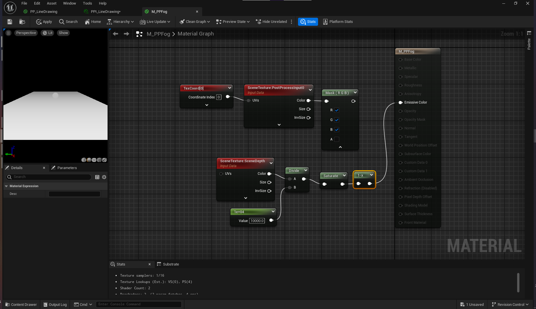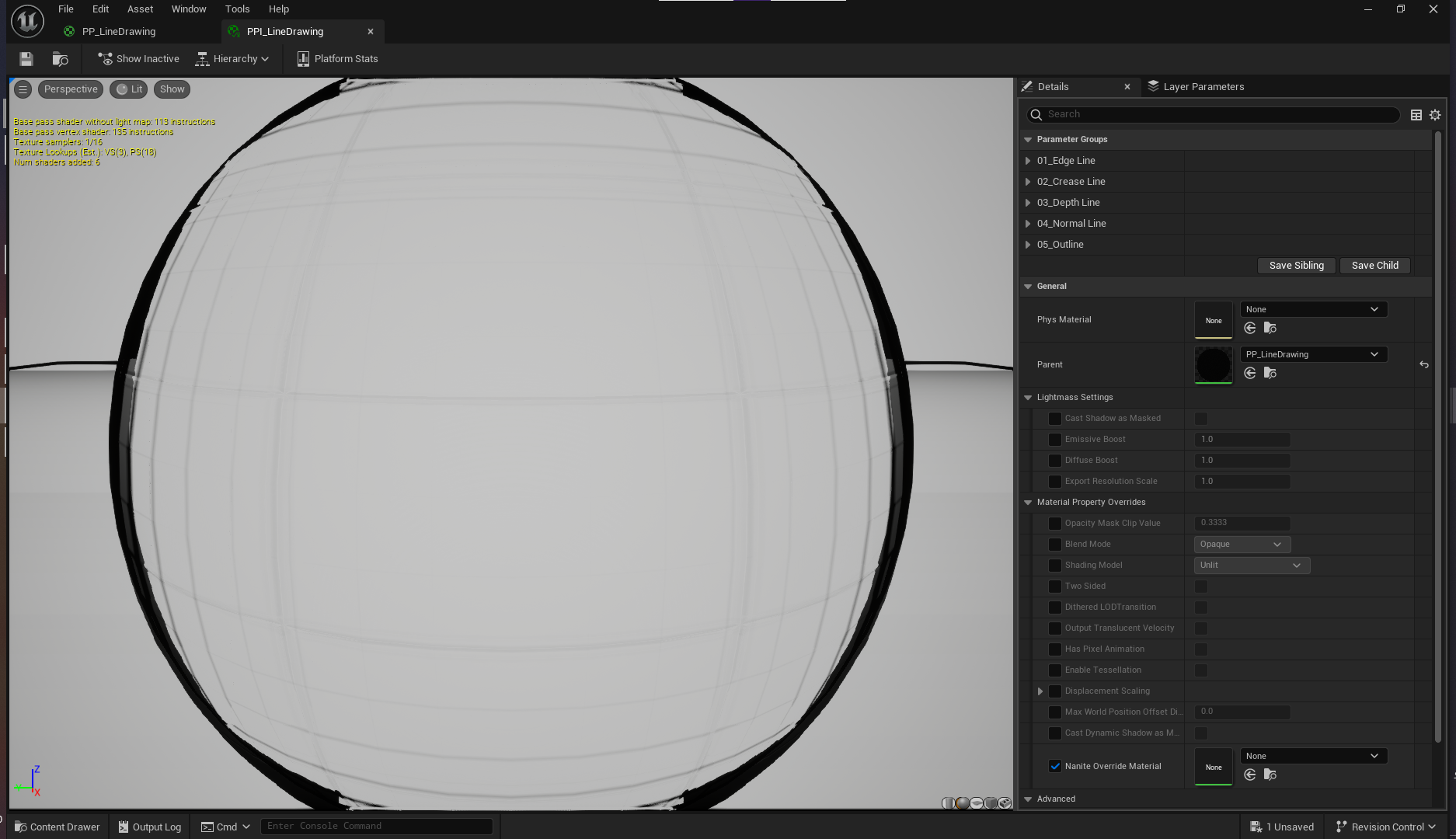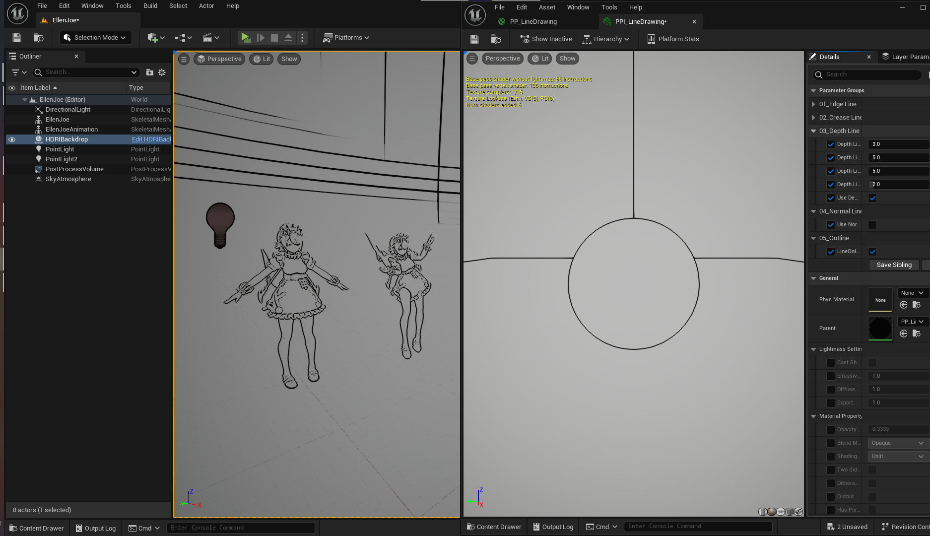 PostProcessVolume의 Post-Process Material에 PPI_LineDrawing을 적용 해 준다.