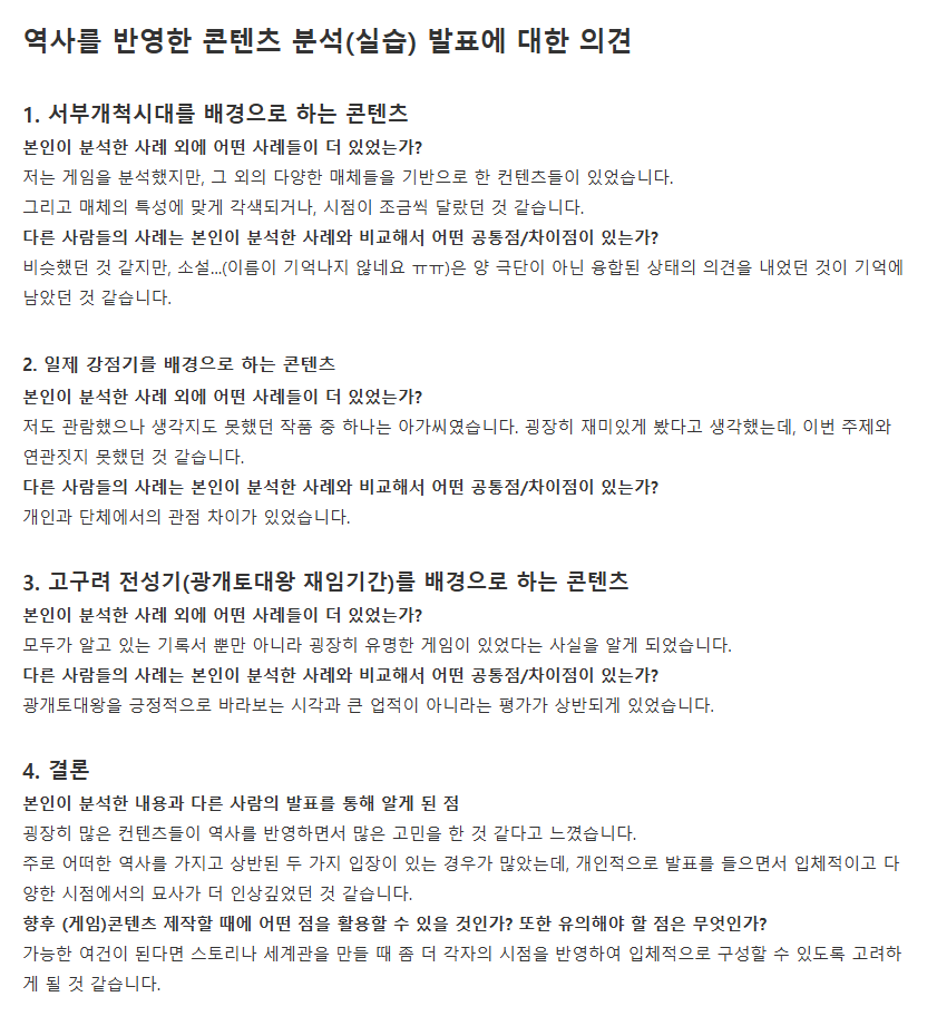 | 게임콘텐츠인문학 - 5주차 : OSMU 발표, 의견 작성 (1) | 2025.04.02 |