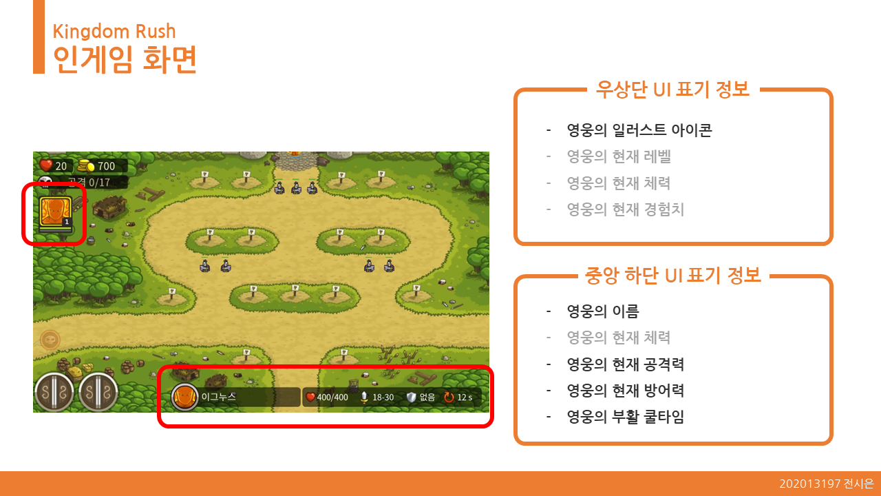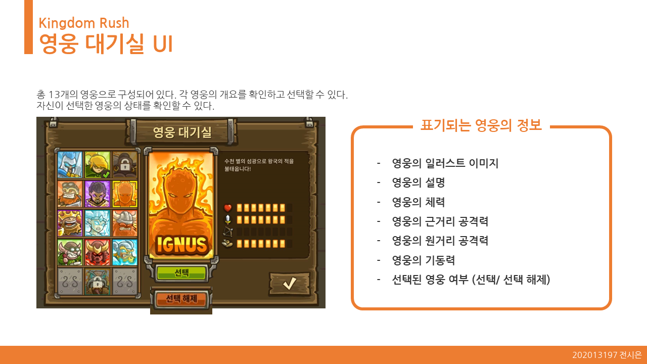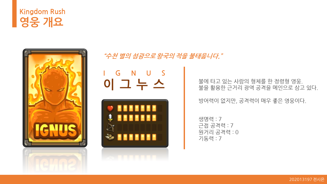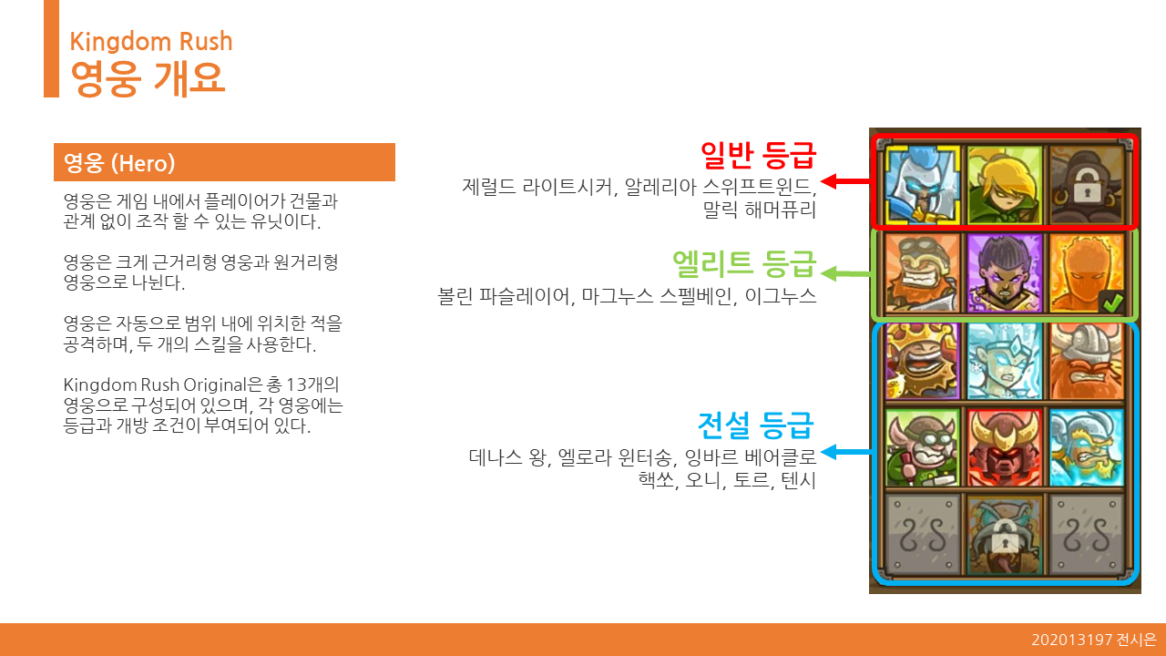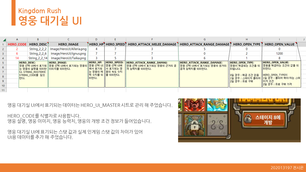 : 킹덤러쉬 영웅의 구현 상황을 보고 데이터 유추하기 (역기획서 형태로) * 기획서 서식은 자유 형식
