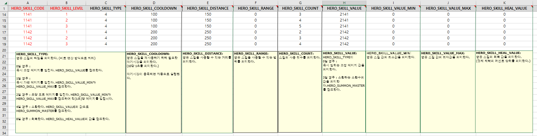 : 히어로 테이블 만들기 * 테이블 역기획으로 정리된 1종의 기존 영웅, 신규 1종의 영웅 콘텐츠 추가하기