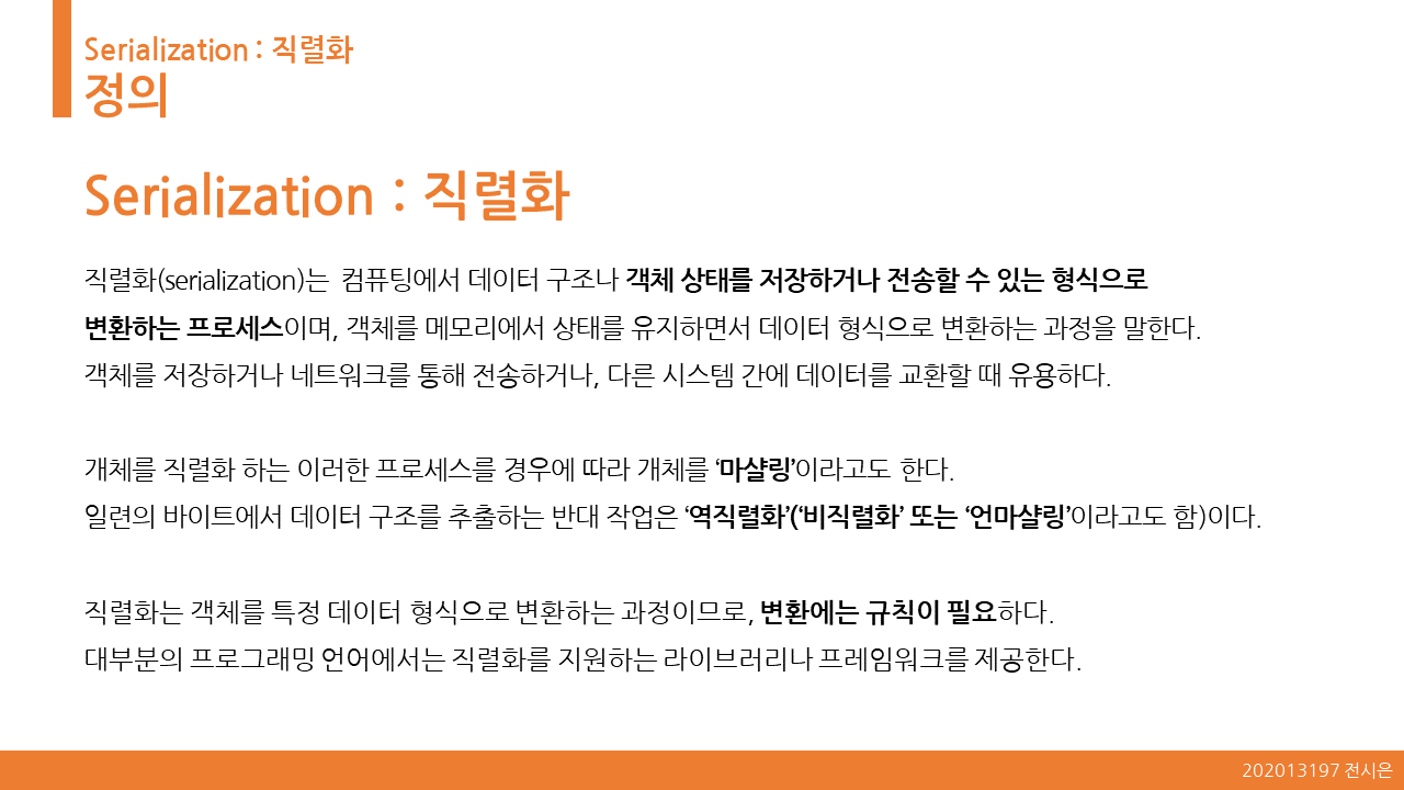 - 마샬링 : 데이터를 바이트 덩어리로 만들어 스트림에 보낼 수 있는 형태로 바꾸는 변환 작업자