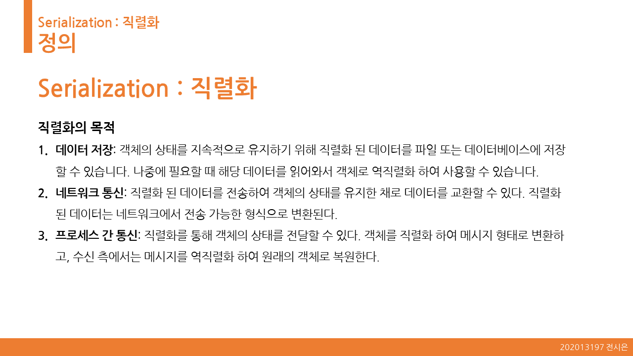 - 언마샬링 : 객체 스트림에서 전달된 바이트 덩어리를 원래의 객체로 복구하는 변환 작업자