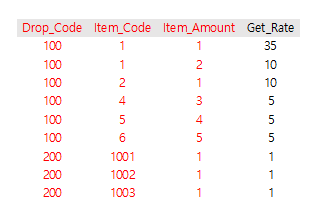 - 결과물 리스트의 개수는 드랍 유형에 따라서 다를 수 있고 각 드랍 결과물의 확률을 지정할 수 있다.