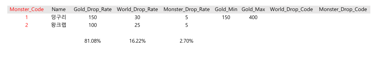 - 몬스터는 죽을 때 [골드 드랍], [월드 드랍], [몬스터 드랍] 중 1개의 드랍유형을 선택하여 결과물을 제공한다.