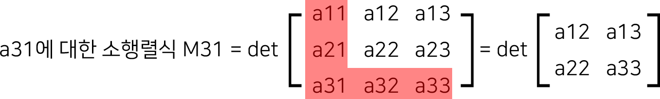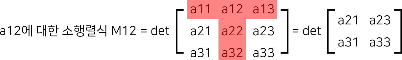 정사각형 A의 원소 aij에 대한 소행렬식 Mij는 i행과 j열의 모든 원소들을 제거한 후 남은 행렬의 행렬식이다.